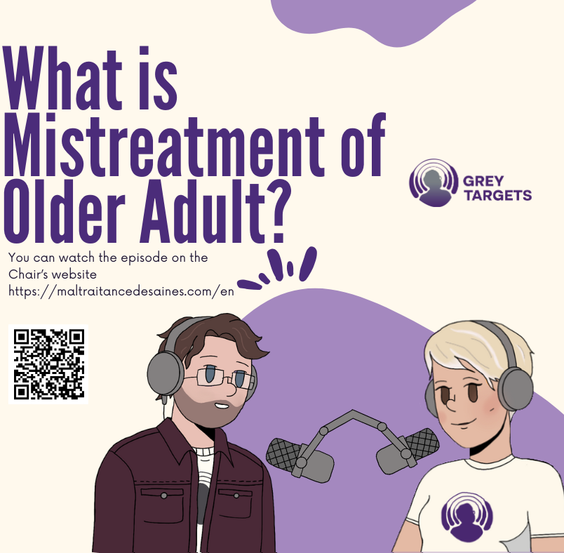 In this section, you will find the official podcast of the Research Chair on Mistreatment of Older Adults entitled Grey Targets. Hosted by the Chairholder, Mélanie Couture and the Chair’s coordinator, Kevin St-Martin this podcast will address many subjects linked to mistreatment of older adults.
