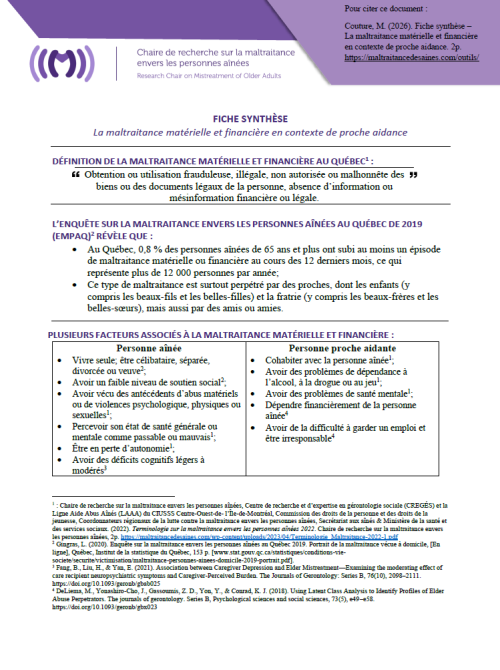 Fiche synthèse résumant les points saillants du webinaire : « La maltraitance matérielle et financière en contexte de proche aidance » par Mélanie Couture. Cliquez ici pour la consulter.