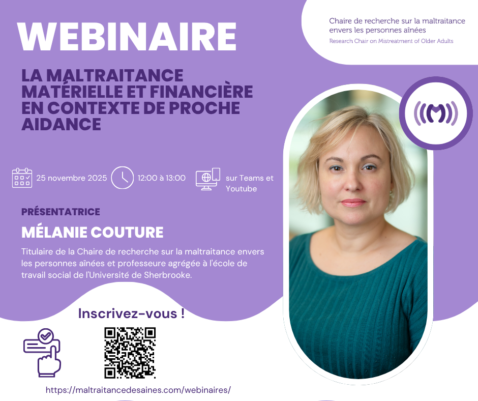 La Chaire de recherche sur la maltraitance envers les personnes aînées vous invite à son prochain webinaire intitulé La maltraitance matérielle et financière en contexte de proche aidance, qui se tiendra le 25 novembre 2025 de 12h à 13h. La titulaire de la Chaire, Professeure Mélanie Couture, partagera des données probantes permettant de mieux comprendre ce qu’est la maltraitance matérielle et financière (y compris la distinguer des situations de fraude) et de se familiariser avec ses conséquences néfastes. Le tout sera illustré à l’aide d’exemples concrets impliquant des dyades personnes proches aidantes-personnes aidées. La période d’inscription est terminée.
